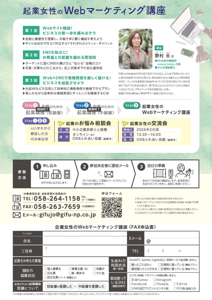 岐阜県(男女共同参画・女性の活躍支援センター)様主催の、女性の起業支援事業の一環として開催されたWebマーケティング連続講座の講師を担当いたしました。