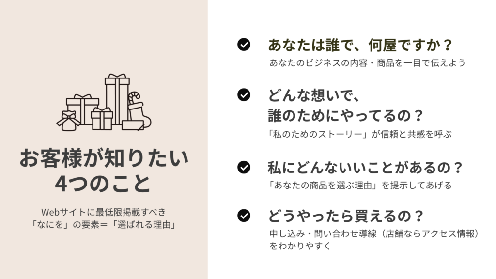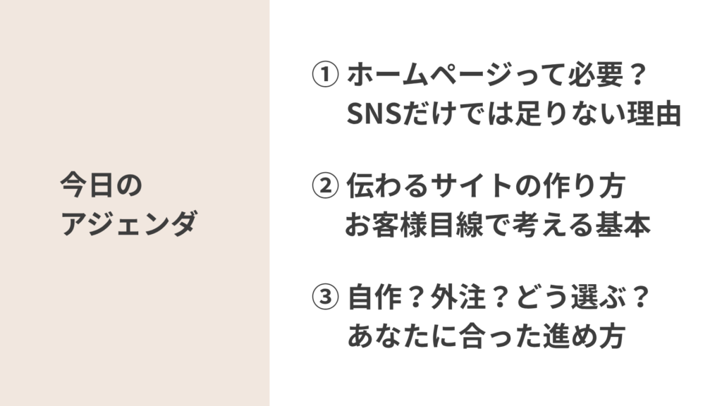 - SNSだけでは足りない理由、Webサイトが果たす役割、伝わるサイト構成の基本、自作と外注それぞれのメリット・注意点などを扱いました。