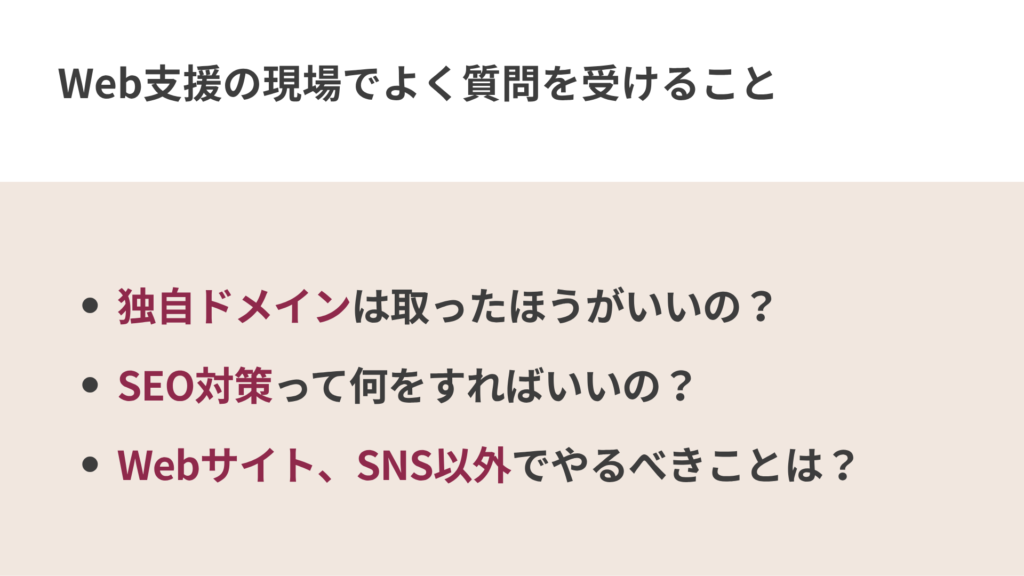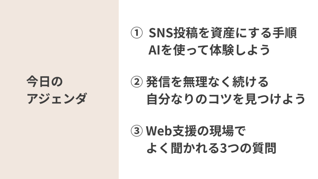 - SNS投稿を資産として蓄積していく考え方や、ChatGPTをコンテンツ作成に活用する方法、Web制作や支援の現場でよく尋ねられる質問などを取り上げました。