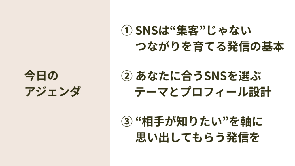 - SNSを集客ツールとだけ捉えず、つながりを育てる場として活かすという考え方を中心に、テーマ設計やプロフィールづくりについて整理しました。